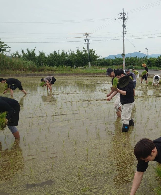 機械で田植えをした後、稲の列に隙間ができてしまったのでベトナムからの技能実習生や特定技能の方々に、隙間を埋めるお手伝いをしてもらいました。